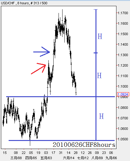 受制於3~5月的底部型態,CHF走到第2個H高度下跌時出現短暫的震盪(藍色箭頭處),可惜當時還在歐債風暴裡,直接破底走了個3倍下跌,現在出現完整的底部了,CHF如果出現紅色的回測就是買點,1.09這裡應該會盤整一下,靜觀其變 |